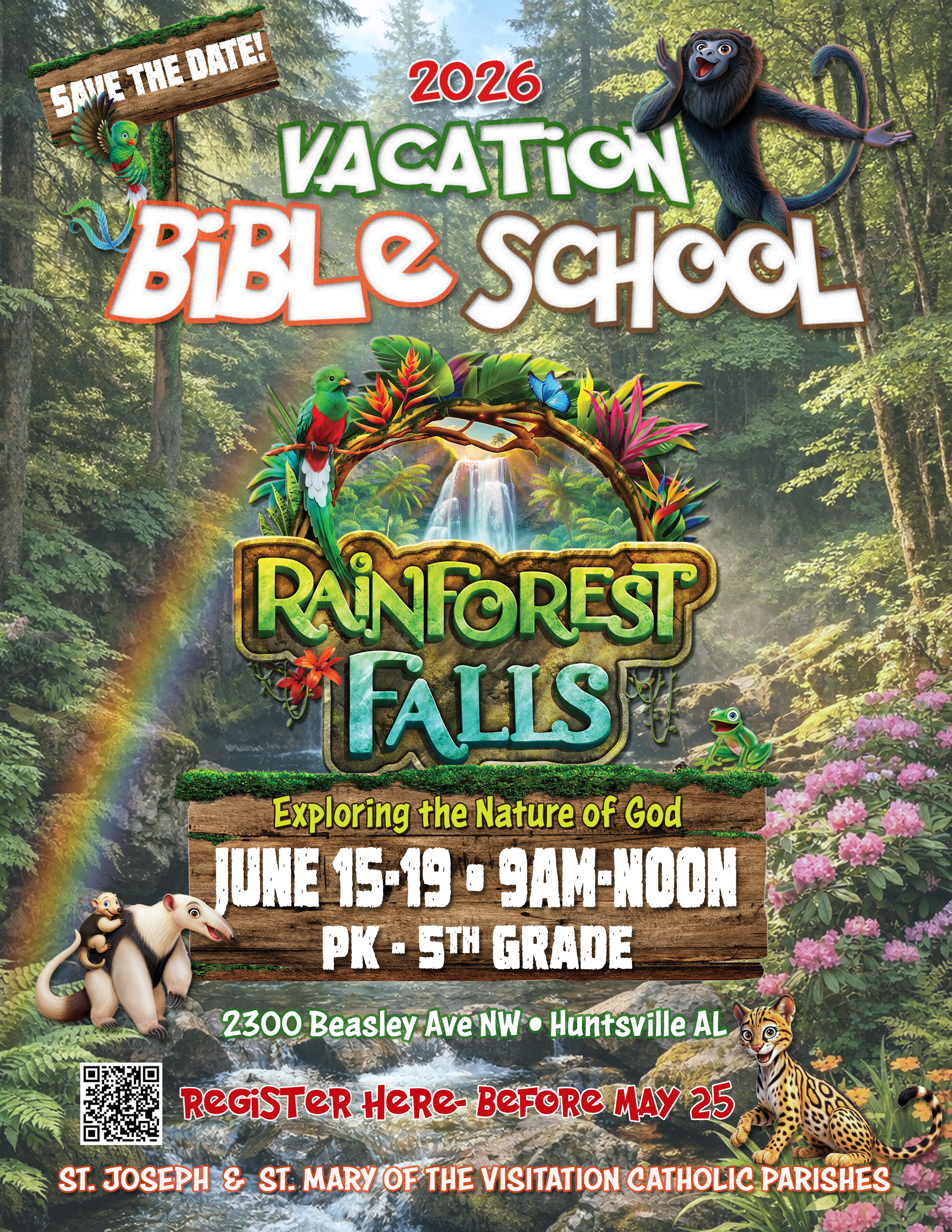 VACATION BIBLE SCHOOL Rainforest Falls-Exploring the Nature of God, June 15-19, 2026 at the Fr. Messmer Center and St. Francis Hall on the St. Joseph Church campus. Ages Pre-K through 5th grade—$30 per child, $90 for a family of three or more. Registration is open through May 25. We need volunteers, so if you would like to help there are sign-up sheets in the church. Sponsored by St. Joseph and St. Mary of the Visitation parishes.